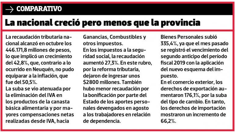 Los números marcan que el impacto negativo sobre la actividad petrolera, originado a partir del congelamiento del precio del barril de crudo, no afectó la percepción de recursos propios, que lograron posicionarse por encima de lo que marcó el Índice de Precios al Consumidor a nivel interanual en la provincia que, a octubre, dio 57,90 por ciento y 47,60 en el acumulado del 2019.