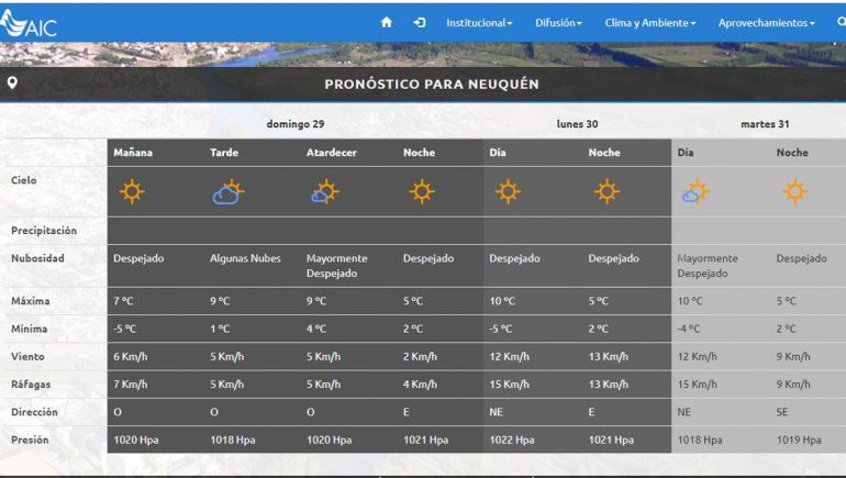 El pronóstico para este domingo anticipa que será una jornada helada. El frío se hará sentir por el ingreso del aire polar que se extiende a toda la región. Se prevé una temperatura mínima de -7 grados y una máxima de 8 grados. El cielo estará despejado durante todo el día. El viento estará prácticamente ausente.