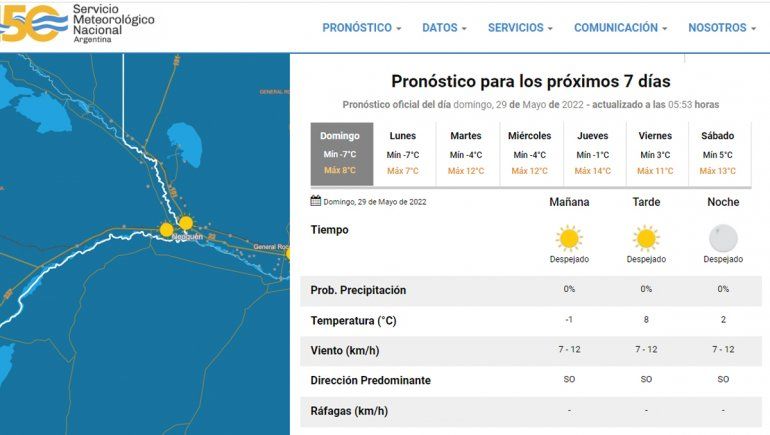 El Servicio Meteorológico Nacional (SMN) pronosticó para este último día del fin de semana de mayo cielo despejado y tiempo muy frío con temperaturas bajo cero. A las 6 de la mañana registró -4,2 grados. Estará soleado y con una mínima que hoy será de -7. Por la tarde alcanzará los 8 grados y hacia la noche descenderá a 2 grados. El viento estará entre 7 y 12 kilómetros proveniente del sector sudoeste.