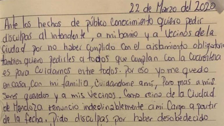 "Ante los hechos de público conocimiento, quiero pedir disculpas al intendente, a mi barrio y a vecinos de la Ciudad por no haber cumplido con el aislamiento obligatorio. También quiero pedirles a todos que cumplan con la cuarentena, ya que es para cuidarnos entre todos. Por eso yo me quedo en casa, con mi familia, cuidándome a mí, pero más a mis seres queridos y a mis vecinos. Como reina de la Ciudad de Mendoza renuncio indeclinablemente a mi cargo a partir de la fecha. Pido disculpas por haber desobedecido la medida y les pido a todos que nos cuidemos y nos quedemos en nuestras casas", manifestó Leiva, quien representó al barrio La Favorita.