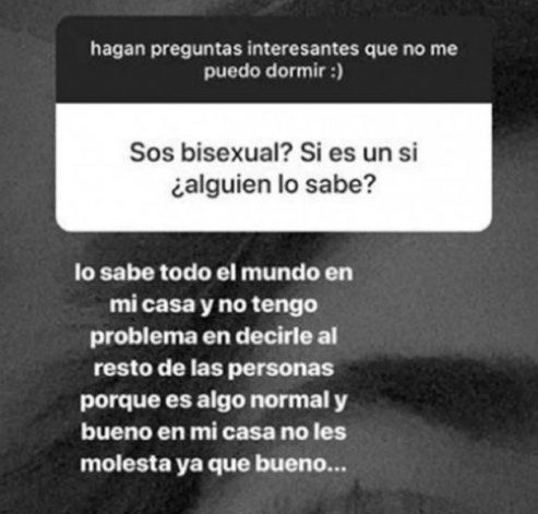 Un seguidor le preguntó si era cierto que ella “era bixesual”. "¿Sos bisexual? Si es un "sí", ¿alguien lo sabe?", indagó uno de ellos. "Lo sabe todo el mundo en mi casa y no tengo problema en decirle al resto de las personas porque es algo normal. No les molesta, ya que bueno…", contestó, en un guiño sobre la historia de su padre, quien tuvo romances con hombres (Guido Süller y Rodrigo Díaz) y mujeres (Virginia Gallardo, Érika Mitdank, Violeta Lo Re y Claudia Ciardone) y se declaró bisexual en 2011, en plena fama.