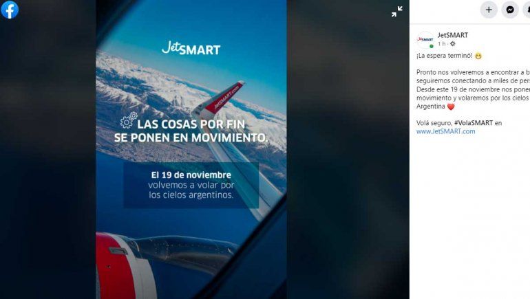 “En Jetsmart, estamos en condiciones de volver a volar y tenemos todo listo para hacerlo desde el próximo 19 de noviembre con un itinerario que en esta primera etapa incluirá viajes desde y hacia Buenos Aires y Neuquén, Bariloche, Córdoba, Mendoza, Salta y Tucumán”, explicó Gonzalo Pérez Corral, gerente general de Jetsmart.