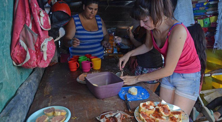 Unos diez chicos ocupan la mesa y sus ojos no se desvían de las rodajas de pan que Ariane y Patricia untan con dulce de leche y paté, mientras una mujer que se acercó a colaborar les sirve un jugo de naranja bastante diluido con agua.