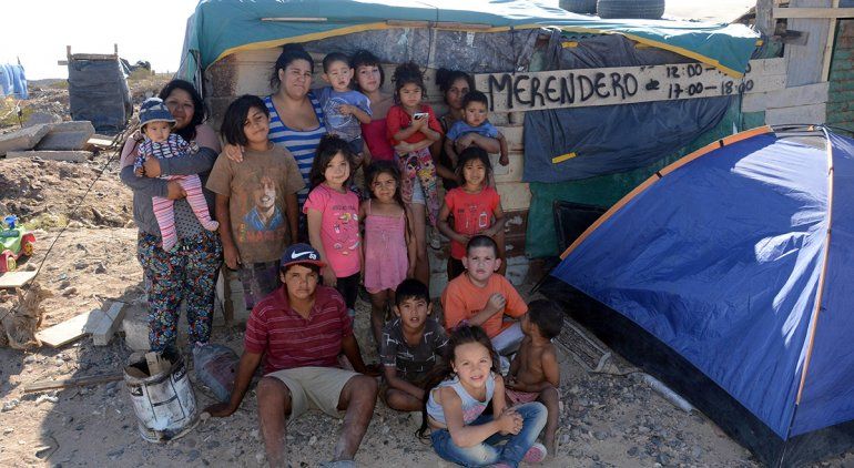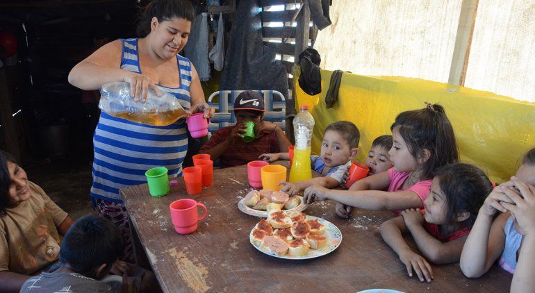 “Vengan a la mesa. Hay pan y jugo”, invita una mujer a cuatro chicos, de entre 7 y 10 años, que patean una pelota de goma naranja que luce bastante desinflada. De inmediato, los “futbolistas” dejan de atender el juego y se acomodan junto a otros chicos más pequeños -algunos descalzos y otros con pañales- alrededor de una desvencijada mesa que es colocada en el centro de la casilla armada con maderas, pedazos de lonas de distintos colores y nylon.