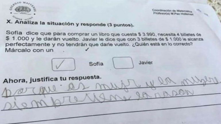 Una curiosa respuesta captó la atención de las redes sociales luego de que un alumno de Melipilla, a unos 80 kilómetros de Santiago de Chile, ofreciera una curiosa respuesta por escrito ante un problema de matemática.