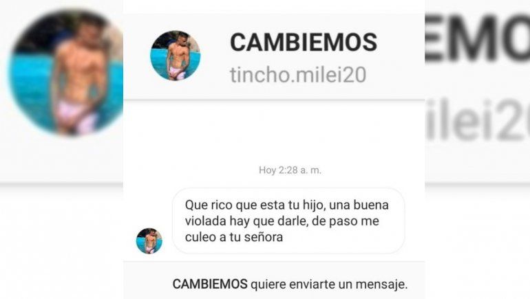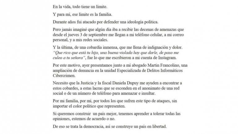 “En la vida, todo tiene un límite. Y para mí, ese límite es la familia. Durante años fui atacado por defender una ideología política. Pero jamás imaginé que algún día iba a recibir las decenas de amenazas que desde el jueves 3 de septiembre me llegan a mi teléfono celular, a mi correo personal, y a mis redes sociales. Y la última, de una cobardía inmensa, que me llena de indignación y dolor”, arranca el escrito, y continúa: “'Qué rico que está tu hijo, una buena violada hay que darle, de paso me cu... a tu señora', fue lo que me escribieron a mi cuenta de Instagram”.