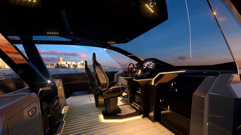 Lo impactante de este yate es que a nivel estético es muy similar a un vehículo de Lamborghini, especialmente en la cabina, que está inspirada directamente en la que tienen los coches de esta marca italiana. Tiene un asiento deportivo y un tablero casi igual al de los automóviles de lujo.