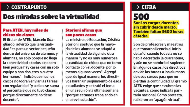 Desde el gremio ATEN no cuestionaron la fecha de regreso, pero advirtieron que hace falta una inversión importante en infraestructura, sobre todo en las escuelas que ya tenían roturas y fallas edilicias antes de la pandemia. Alertaron también sobre el efecto "desgaste" de la virtualidad, que ya cumplió tres meses, y la falta de herramientas de educación a distancia para docentes y estudiantes.