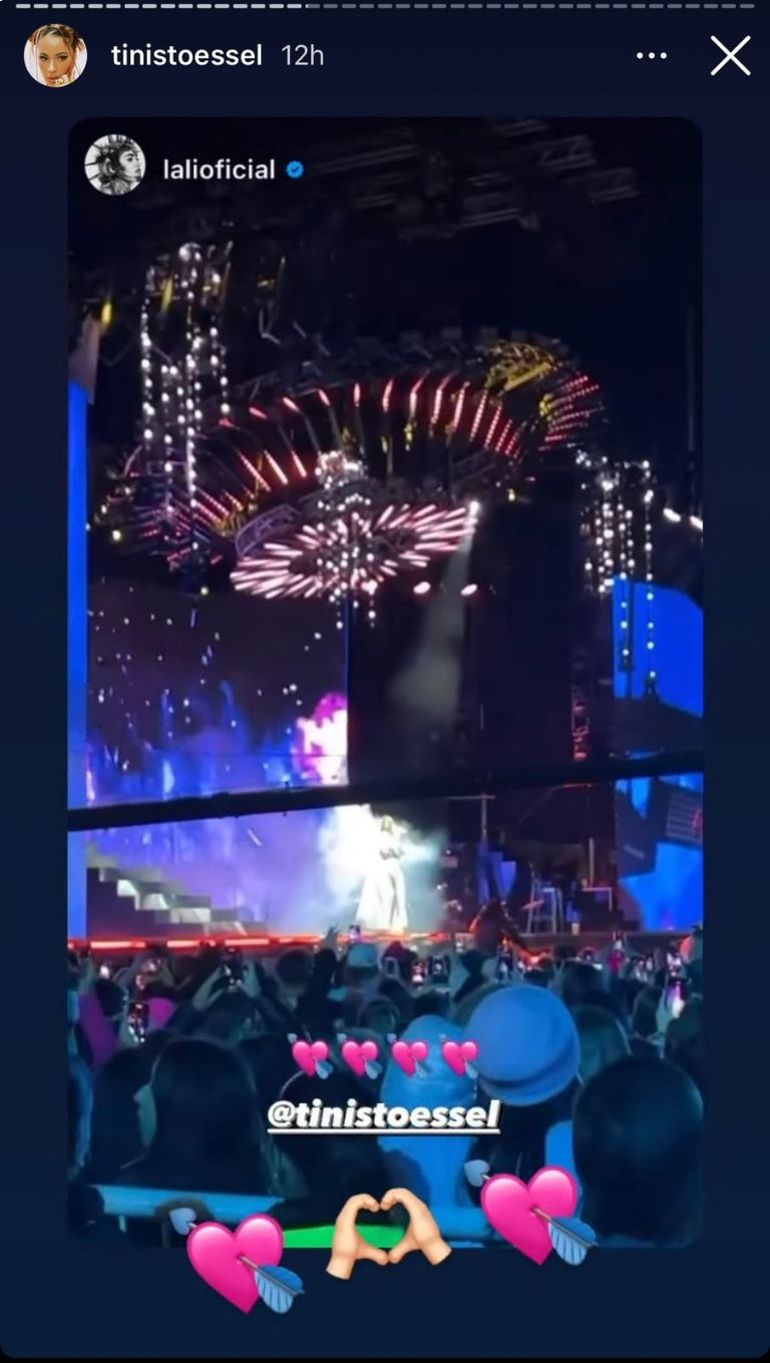 "Dios @tinistoessel", publicó Lali en su cuenta oficial de Instagram ante una Tini que se mostró muy alegre de estar arriba del escenario, contando con el apoyo de su gran amiga, que fue rodeada de algunos conocidos en el recital.