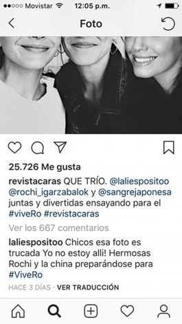 "QUE TRÍO. @laliespositoo @rochi_igarzabalok y @sangrejaponesa juntas y divertidas ensayando para el #ViveRo", decía el epígrafe de del posteo hecho en la cuenta de Instagram de Caras, en donde se veían muy sonrientes las tres actrices.