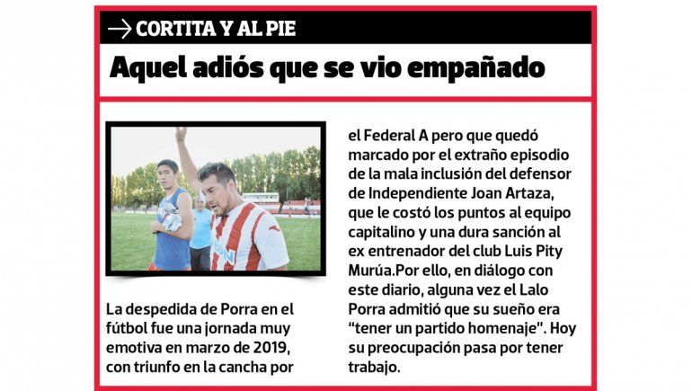 El fútbol fue su vida y le dio renombre y prestigio. Pero la carrera de los jugadores es corta y en el ascenso pocos logran hacer diferencia monetaria. No es el caso del querido Mago. "No me quejo porque viví siempre del fútbol, conocí lugares. El fútbol me dio todo, aunque hoy no tengo nada material", aclará el Lalo, padre de dos chicos.Sabe que "de haber terminado la secundaria" la búsqueda sería un poco más accesible. Pero no se queda en lamentos; ni siquiera reniega de la chance que no fue en Independiente. "El club me abrió sus puertas pero justo estaba atravesando momentos personales y se me complicaba trasladarme desde la zona del Jumbo a La Chacra", recuerda. Y se ilusiona con que "el día de mañana ojalá pueda volver a casa...". Mira para adelante, siempre. Y no pierde la fe. "Uno nunca tiene que bajar los brazos. Soy creyente y pido tener salud y estar bien yo y los seres queridos". Lalo Porra, una leyenda de la pelota regional que merece que le tiendan una mano y no lo ignoren.