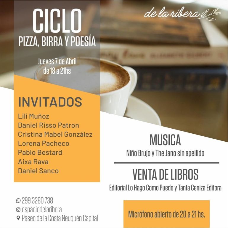 Los amantes de la buena gastronomía y la literatura podrán disfrutar de una propuesta novedosa con el encantador marco del rio Limay. Se trata del ciclo Pizza, birra y poesía, cuyo primer encuentro tendrá lugar este jueves 7 de abril, de 18 a 21, en el restaurante De La Ribera, ubicado en el Paseo de la Costa de Neuquén.