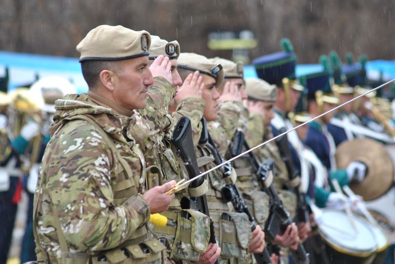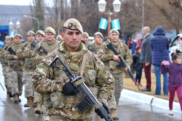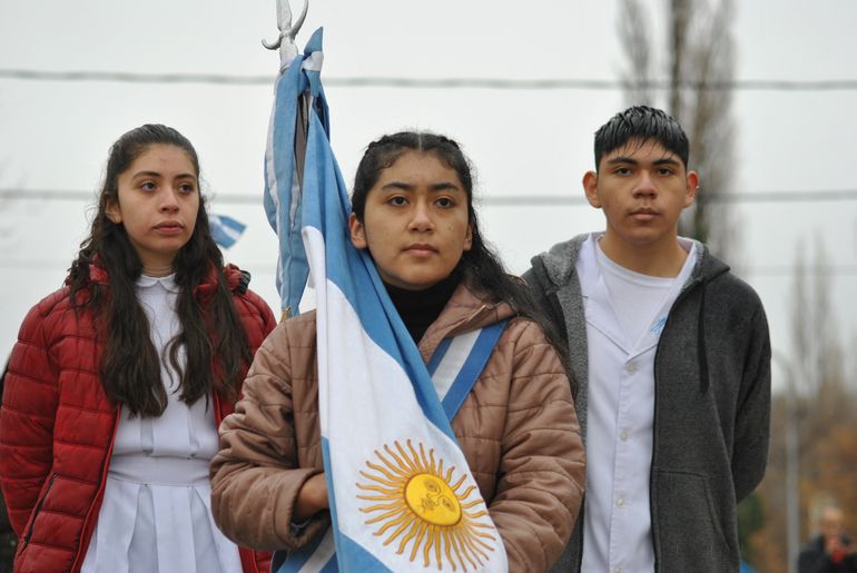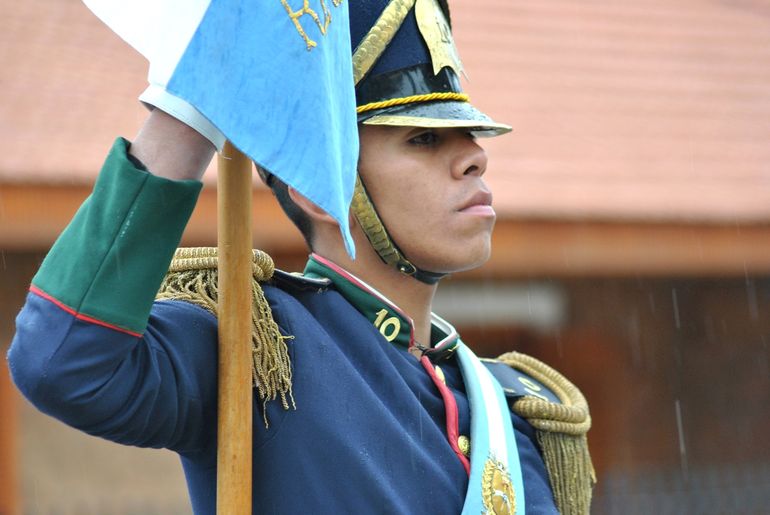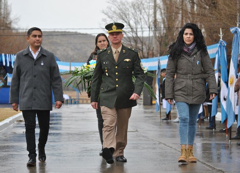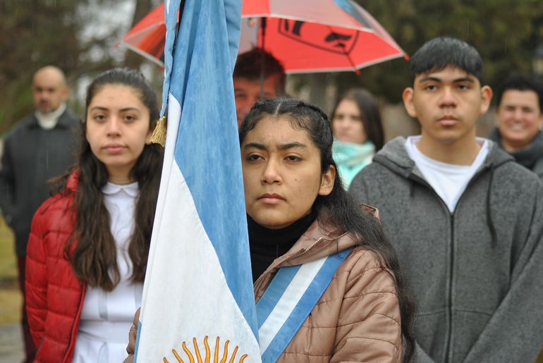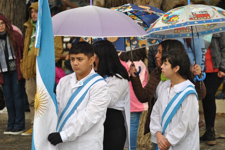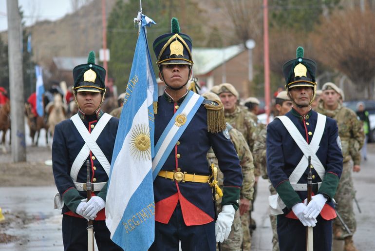 Emocionó ver bajo la lluvia a los alumnos y a los miembros del regimiento covunquino que participaron con una fracción de desfile y la banda militar vistiendo el tradicional uniforme histórico que los distingue.