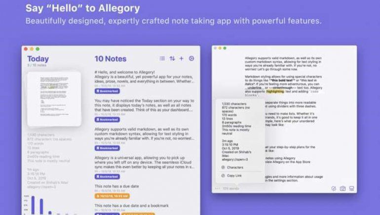 Allegory es una potente aplicación de notas con una interfaz impecable adaptada a macOS. Su experiencia de escritura minimalista, combinada con una serie de potentes características lo convierte en la elección ideal para todo tipo de usuarios. Allegory presenta una interfaz accesible en la que, tanto escritores casuales como autores más experimentados se sentirán cómodos.