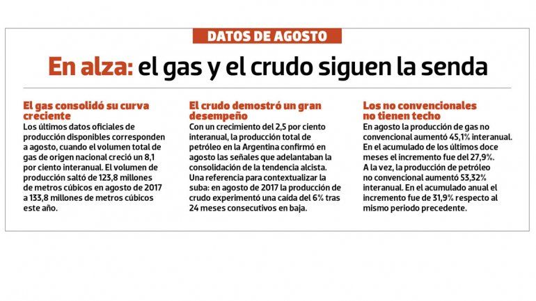 La producción de gas acumulada en los siete primeros meses del año mostró un crecimiento interanual del cinco por ciento, manteniendo la senda de crecimiento que inició hace varios meses. En el mismo lapso, la producción total de petróleo en el país creció un 1,9 por ciento interanual. El repunte de la producción petrolera tardó más que el de la de gas y se explica por la suba de precios internacionales.