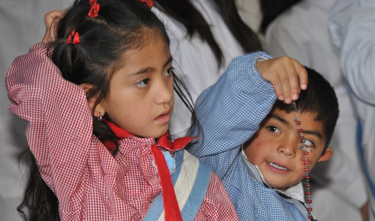 En este escenario, llamó la atención y llenó de ternura a todos la particular situación que protagonizó la docente Cristina Cuevas con sus nenes de jardín de infantes que portaban la bandera de ceremonias; cuando al frente del acto la extensión de los discursos produjo en los pequeños una dispersión propia de la edad. Su abanderada, Mailen Ceballos (de 4 años), se olvidó de la bandera y rápidamente la maestra la sostuvo. La nena comenzó a saludar con alegría a sus familiares mientras que su compañero escolta Mateo luchaba por colocarle un rosario en su cuello. Fue un grato momento que le dio un toque de color y frescura a un acto que hacían los grandes mientras ellos estaban en su mundo.