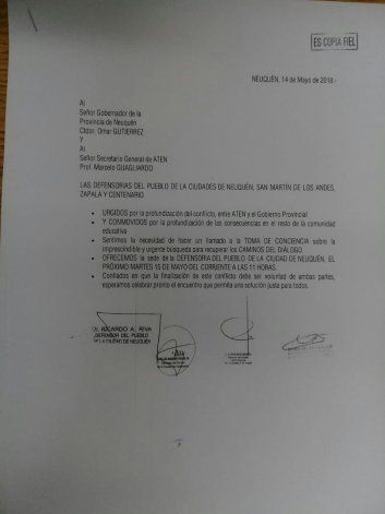 En un escueto comunicado presentado esta mañana y firmado por Ricardo Riva, Fernando Bravo, María Belén Aragón y Carlos Andrés Peralta, las Defensorías del Pueblo de Neuquén, Centenario, Zapala y San Martín de los Andes, se ofrecieron como mediadores en el conflicto entre ATEN y el Gobierno, que ya lleva 33 días de paro.