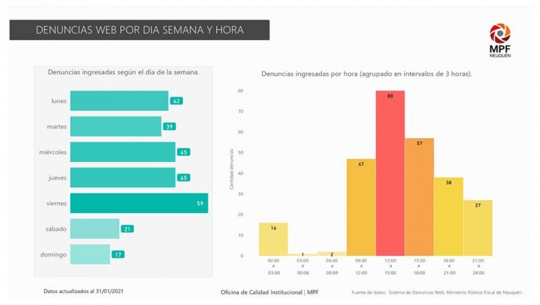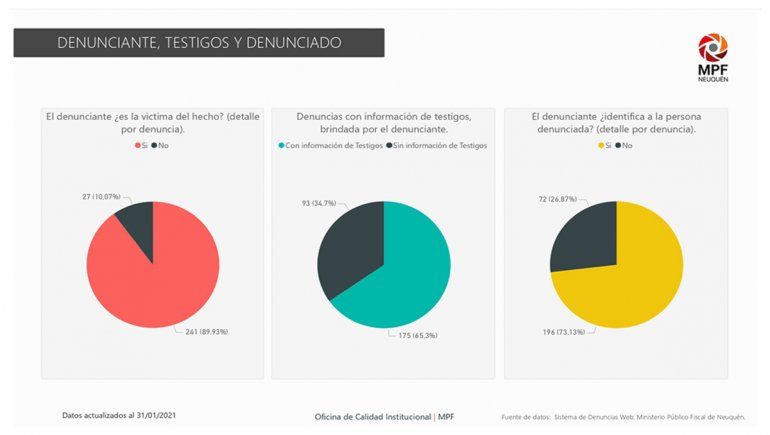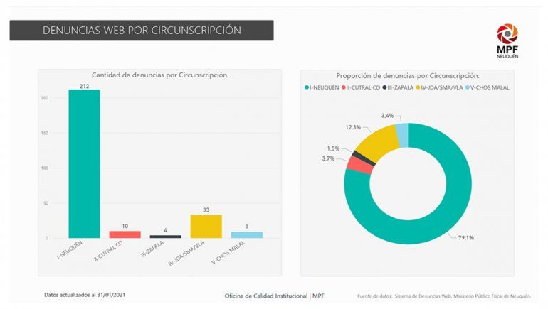 De acuerdo a un informe elaborado por la oficina de Calidad Institucional del organismo, entre el 22 de octubre de 2020 y el 31 de enero de 2021 se recibieron un total de 268 denuncias, siendo el promedio por mes de 67 y casi el 80% se correspondieron con denunciantes de la Primera Circunscripción (Neuquén capital y alrededores). También se indicó que el 98% del total ya tiene un legajo abierto y se encuentra bajo investigación.
