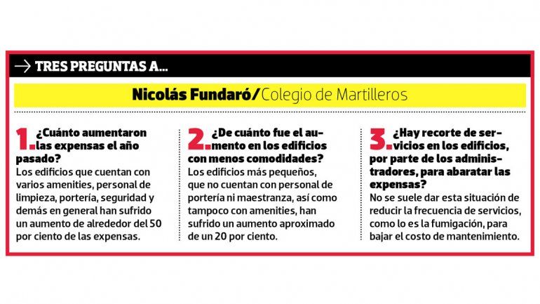 Recordó que en 2018 hubo aumentos de hasta el 50 por ciento en los gastos de mantenimiento de los inmuebles que, inevitablemente, se trasladaron a los inquilinos. Sin embargo, consideró que este año “no hubo grandes variaciones”. “Quizá se haya registrado una pequeña variación por el pago de sueldos y el medio aguinaldo del personal, pero debería bajar con la próxima factura”, comentó.