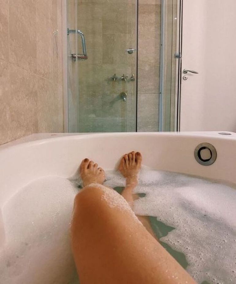 El cuarto de baño cuenta con paredes recubiertas con grandes azulejos símil piedra en color beige. Por un lado tiene una elegante ducha con grifería moderna y paredes de vidrio. De todos modos, el lugar preferido de Brenda es la bañera con hidromasaje, donde suele tomar largos baños de inmersión para relajarse. Este también es uno de los sectores y actividades más "instagrameables".