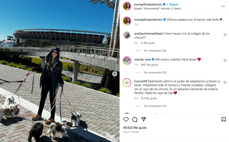 La mujer del director técnico Martín Demichelis publicó una foto en su cuenta de Instagram paseando a sus cinco perritos por el barrio porteño de Núñez, con el Monumental de fondo. “Últimos paseos por el barrio más lindo”, escribió la modelo. Inmediatamente, Wanda le comentó la publicación. “¡Me muero! ¿Cuántos hijos tenés?”, le preguntó la conductora de Bake Off Famosos.