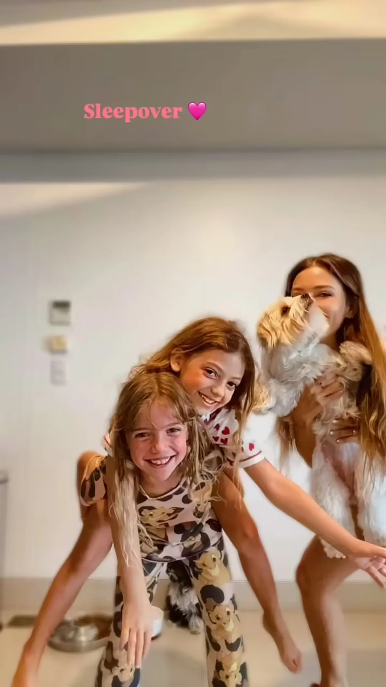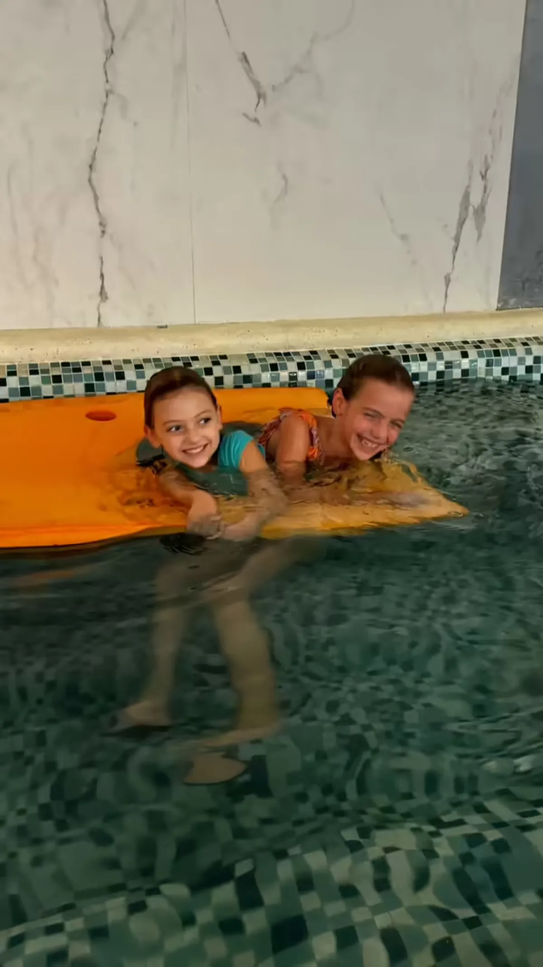En otro de los videos también se las puede ver disfrutando de una piscina climatizada. Por último, las niñas posaron en pijamas con Evangelina y su perrito.