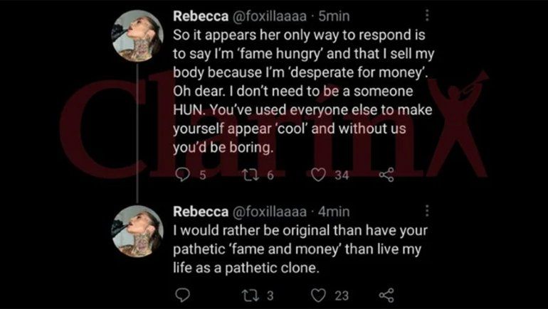 Con todo esto, Rebecca no se quedó al margen y volvió al ataque, aunque luego eliminó sus publicaciones. "Así que parece que su única forma de responder es decir que tengo 'hambre de fama' y que vendo mi cuerpo porque estoy 'desesperada por plata'", comenzó indignada la modelo de 30 años que vende contenido erótico en la plataforma OnlyFans.