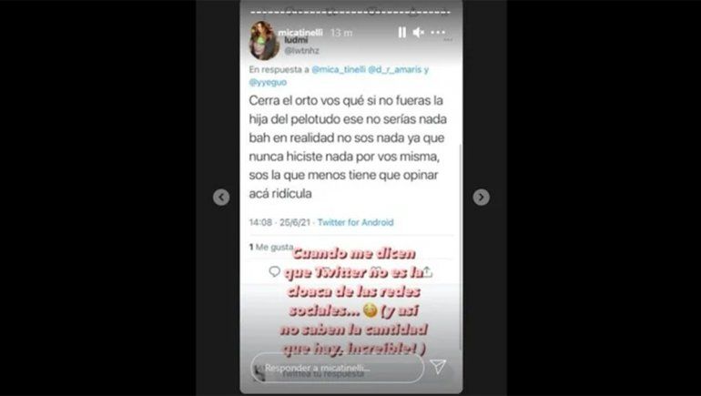 "¿Estamos de acuerdo en que Twitter es la cloaca de las redes sociales? La verdad es que las redes sociales se están volviendo cada vez más cloacas, y eso es porque la gente tiene cada vez más mier... y más veneno adentro", fue lo primero que dijo Mica Tinelli en sus stories de Instagram, en una clara alusión a los comentarios que había hecho Rebecca en esa plataforma.