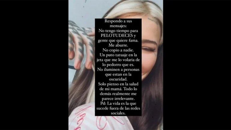 Horas después del descargo de su hermana, Cande Tinelli apareció en Instagram y también le contestó a Rebecca Fox y se guardó absolutamente nada. "No tengo tiempo para pelot... y gente que quiere fama. Me aburre", arrancó y continuó: “No copio a nadie. Un p... tatuaje en la jeta que me lo volaría de lo pedorro que es. No iluminen a personas que están en la oscuridad. Solo pienso en la salud de mi mamá y todo lo demás es irrelevante", expresó la hija de Marcelo Tinelli y Soledad Aquino, quien días atrás recibió un trasplante de hígado.
