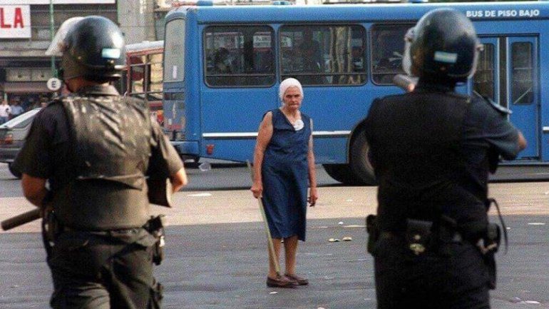 Otra de las fotos donde se ve a una abuela con un palo frente a dos policías armados cuando uno de ellos le apunta. Esa imagen de las protestas ocurridas el 19 y 20 de diciembre de 2001 y fue tomada por el equipo de fotógrafos de Télam.