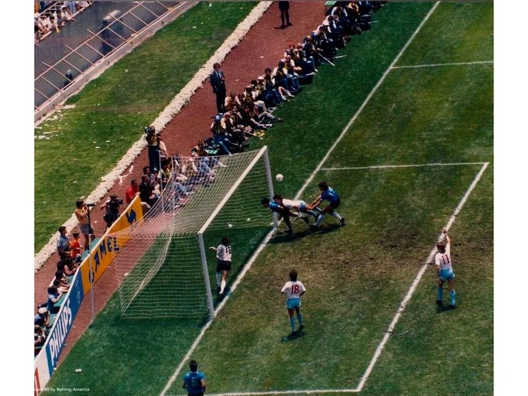 Fueron cuatro las fotos tomadas por el irlandés Joe O’Connell que se viralizaron en las distintas plataformas. En la primera de ellas se ve, desde un ángulo inédito, el salto que protagonizaron Maradona y Shilton. Se puede apreciar a la perfección como Dios simula estar metiendo un cabezazo antes de tocar el balón con su mano para sellar el 1-0.