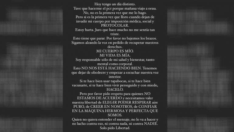 “No es la primera vez que lo hago, pero sí es la primera vez que lloro cuando dejan invadir mi cuerpo por imposición médica, social y protocolar. Estoy harta, juro que hace mucho no me sentía tan triste”, explicó en una de sus historias y buscó sumar adeptos entre sus seguidores. “Esto tiene que parar. Por favor no bajemos los brazos. Sigamos alzando la voz en pedido de recuperar nuestros derechos”.
