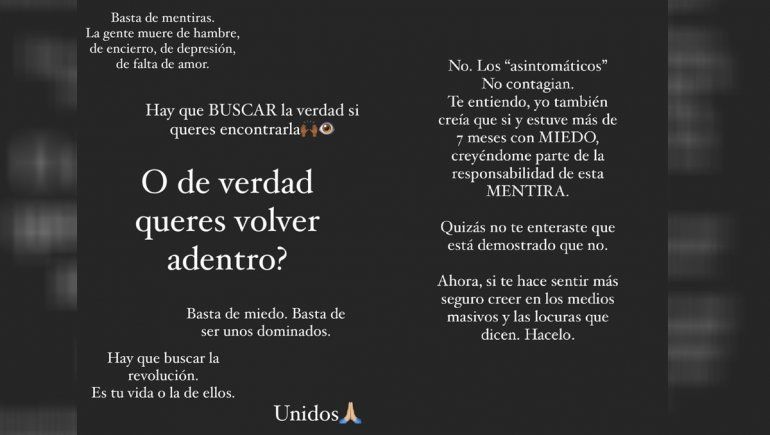 En el mismo sentido, aunque cada vez más dura en su discurso, la ex conductora de Escape perfecto volvió a minimizar los alcances del coronavirus, que en las últimas 24 horas reportó solo en Argentina 23.683 casos. “La gente muere de hambre, de encierro, de depresión, de falta de amor”, escribió y llamó a los seguidores para revelarse: “Basta de miedo. Basta de ser unos dominados. Hay que buscar la revolución. Es tu vida o la de ellos”.