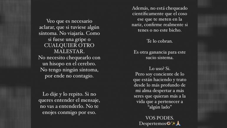 Ante las repercusiones de sus dichos, Ivana creó necesario realizar algunas aclaraciones. Por un lado, manifestó que no se subiría a un avión si tuviera algún síntoma. Pero al mismo tiempo, afirmó que ante el primer malestar no necesita chequearlo “con un hisopo en el cerebro. No está chequeado que el coso ese que te meten en la nariz confirme realmente si tenés o no este bicho. No tengo síntomas, por ende no contagio”, señaló, como pie para meter al procedimiento en su teoría antisistema: “Te lo cobran, es otra ganancia para este sucio sistema. Despertemos”, agregó.