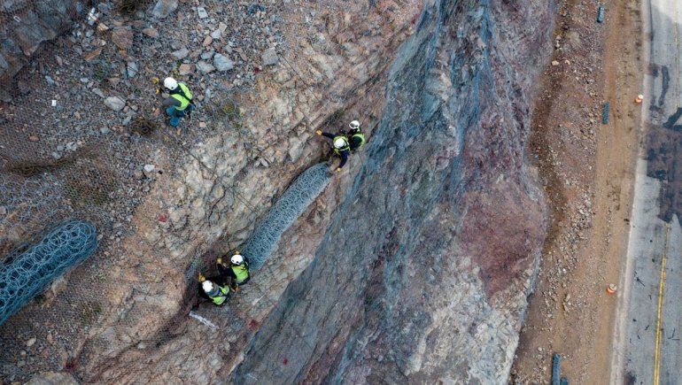 En total, ya fueron instaladas más de 8.000 metros cuadrados de defensas, ubicadas en forma de paños, de cuatro metros de ancho cada uno, que luego se unen entre sí y son asegurados a la ladera por medio de cables de acero. Los trabajos son ejecutados por un equipo de cinco profesionales especializados en sistemas de protección de taludes con capacitación en técnicas de escalada y se estima que estén completos en enero de 2020.