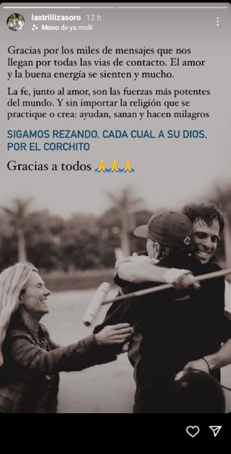 "Fuerza, Corchito, te amamos, todos rezamos por vos", publicaron en una historia dedicada, obviamente, al hijo mayor de María Emilia, hijo también del reconocido expolista que lleva el mismo nombre, Clemente Zavaleta.