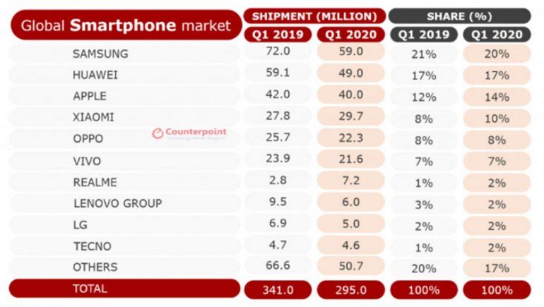 Según su estudio del mercado, las ventas de celulares cayeron 13% en el primer trimestre de 2020. Xiaomi y Realme fueron los únicos fabricantes que experimentaron ventas.
