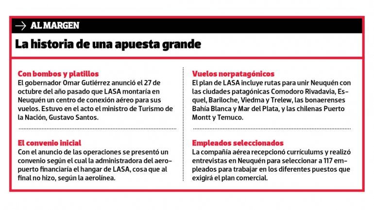 Por eso, dijo, el miércoles pasado se puso en marcha el plan de obras tendiente a concretar el hangar de LASA en el aeropuerto. Se trata del segundo en tamaño de los que existen en el país, según lo anunciaron la empresa y el Gobierno, al darse a conocer que la línea aérea tendría su hub en la aeroestación de la capital neuquina.