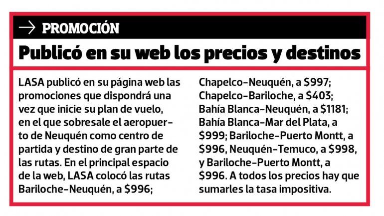 El plan completo que Transporte le aprobó a LASA incluye las rutas Neuquén- Santa Rosa- Mar del Plata, Neuquén-Chapelco- Bariloche, Neuquén- Bahía Blanca- Mar del Plata, y Neuquén- Temuco (Chile).