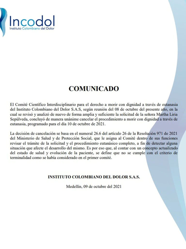 “Según la reunión en la cual se revisó y analizó de nuevo de forma amplia y suficiente la solicitud de la señora Martha Liria Sepúlveda, concluyó de manera unánime cancelar el procedimiento a morir con dignidad a través de eutanasia, programado para el día 10 de octubre de 2021″, señala en un comunicado el Incodol.