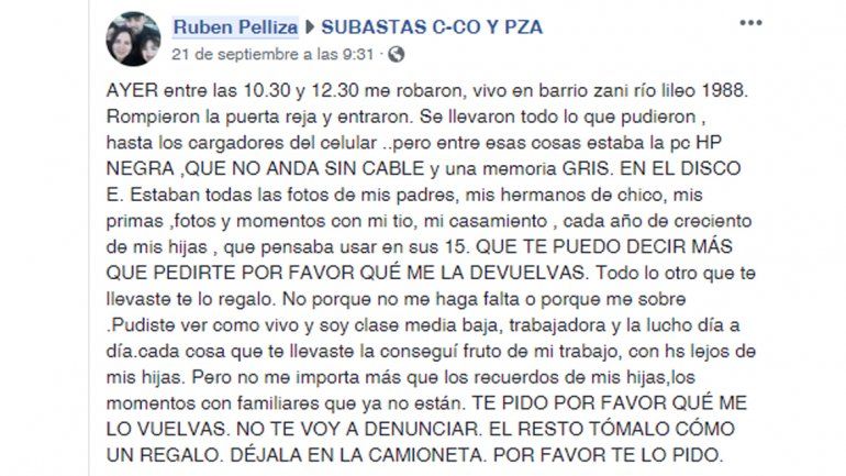 Buscando llegar a los ladrones, el hombre hizo una publicación en el grupo Subastas de Cutral Co y Plaza Huincul de Facebook, donde insistió que sólo quiere recuperar las fotos. “En el disco estaban todas las fotos de mis padres, mis hermanos de chico, mis primas, fotos y momentos con mi tío, mi casamiento, cada año de creciendo de mis hijas, que pensaba usar en sus 15… Todo lo otro que te llevaste te lo regalo. No porque no me haga falta o porque me sobre. Pudiste ver como vivo y soy clase media baja, trabajadora y la lucho día a día… Cada cosa que te llevaste la conseguí fruto de mi trabajo, con horas lejos de mi familia. Pero no me importa más que los recuerdos de mis hijas, los momentos con familiares que ya no están“, escribió.