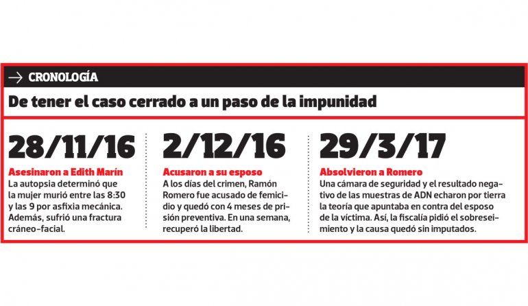 Edith Marín, de 59 años, fue asesinada en el comedor de su casa del barrio Villa Ceferino. La golpearon y estrangularon para matarla. Quedó tirada boca abajo inmersa en un charco de sangre. Su esposo Ramón Romero arribó de trabajar aquel 28 de noviembre de 2016 y aseguró que la encontró muerta. Para los investigadores él era el principal sospechoso, pero no pudieron demostrarlo y fue sobreseído. A tres años, su familia reclama justicia y que el femicidio no quede impune.