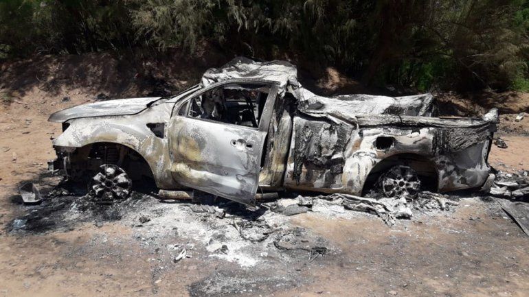 Fuentes policiales confirmaron que la camioneta Ford Ranger con cúpula apareció ayer a 25 kilómetros de Rincón de los Sauces totalmente incendiada.