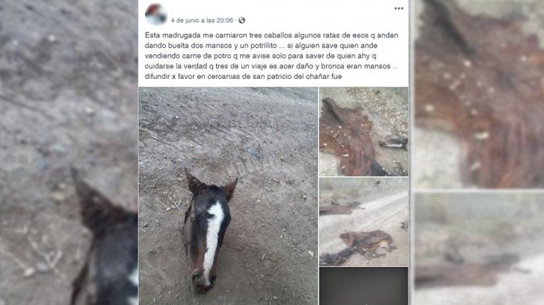 Un puestero de San Patricio del Chañar denunció en sus redes sociales que le robaron tres caballos, de los cuales sólo encontró sus cabezas y su piel debido a que fueron faenados.