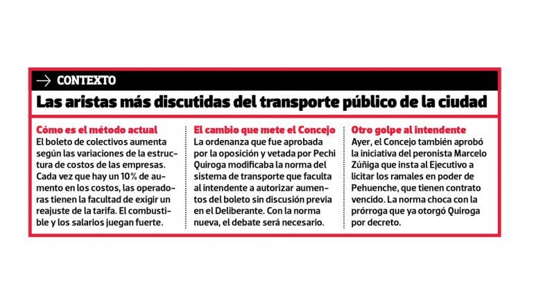 La oposición en pleno da por sentado que Pechi Quiroga deberá aplicar la ordenanza que elimina los aumentos automáticos del boleto en función de la variación de la estructura de costos de las empresas concesionarias, en este caso Autobuses Neuquén (Indalo) y Pehuenche. Si así fuera, cada aumento de la tarifa del transporte urbano debería superar un filtro más complejo, ya que debería pasar por el Concejo Deliberante.
