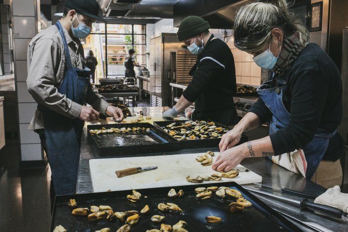 En el taller reciben productos frescos y lejanos con una logística maravillosa. Las cholgas que están pelando con Mecha y algunos ayudantes vienen de Madryn. Las limpian, separan cáscara de carne y filtran el jugo que largan. Luego ese jugo forma parte de la lata. Así stockean su cocina conservera y tienen entre su carta pedacitos del Atlántico para quienes se acerquen a comer o tomar algo cualquier día.