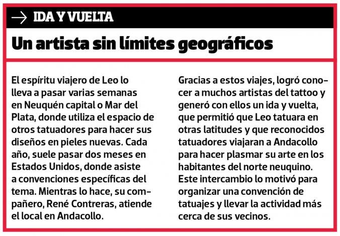 Antes de convertirse en el primer tatuador del norte neuquino, Leo Gagliardi fue estudiante de Administración de Empresas, viajero y empleado de comercio. Pero más atrás en el tiempo, y en su Andacollo natal, fue un adolescente de 14 años que se fascinó al ver un anciano tatuado en una publicidad y entendió que quería llegar a viejo con sus vivencias grabadas en la piel.
