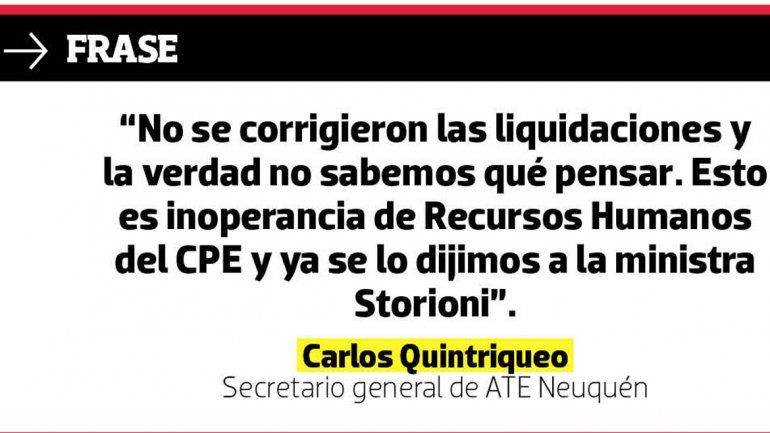 El problema, según comentó a LM Neuquén Carlos Quintriqueo, secretario general de ATE Neuquén, se debió a un error de liquidación, en principio por el plus de vacaciones que reciben los empleados al CCT. Y por eso apuntaron contra coordinador de Gestión de Recursos Humano, Héctor Cancio.