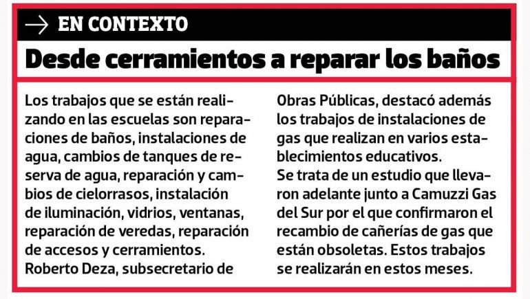 La mayoría de los arreglos escolares son absorbidos a través de estos convenios. No obstante, cuando aparece alguna obra de recambio de cañerías, el dinero se gira desde la esfera provincial.
