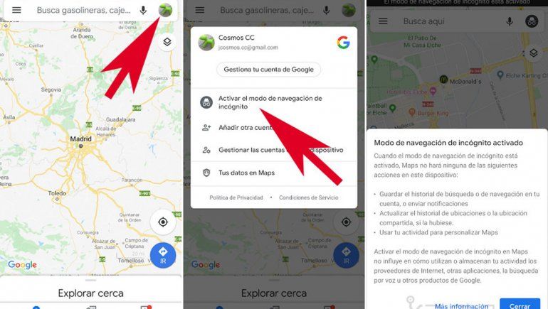 Google Maps se suma a otras herramientas como Chrome para utilizarlas en forma privada sin dejar rastro de nuestras búsquedas en el historial. En el caso de Maps, las trayectorias y búsquedas no se almacenarán en la cuenta.